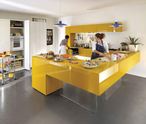 Lago Cucine - bucatarie modulara, cu design modern, realizata din MDF placat cu sticla vopsita galben si cu rezistenta crescuta la caldura, socuri si greutate.