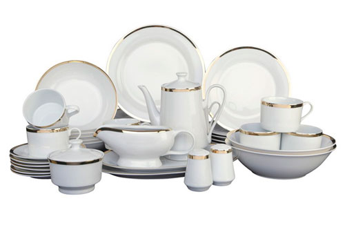 Elite - set vesela, din 40 de piese, din portelan decorat in alb si auriu. Pret: 677 lei.