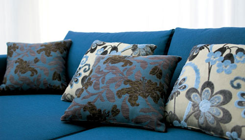 Artur - canapea Linea Italia, accesorizata cu pernute cu imprimeu floral.