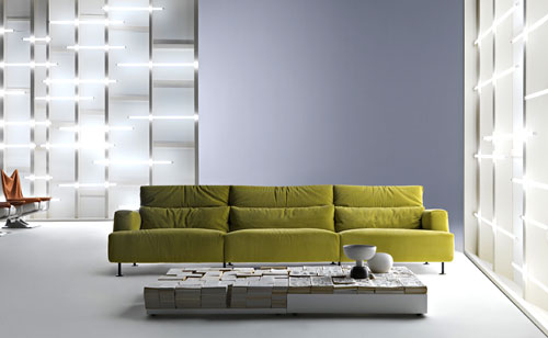 190 Aire - canapea Cassina, cu husa din catifea verde-crud, picioare slim, metalice finisaj negru, mat, cu optiune de reglare pe inaltime a spatarului.