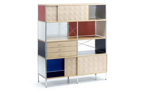 ESU Bookcase - Design: Charles & Ray Eames. In 1949, Charles si Ray Eames au lansat un nou sistem multifunctional de rafturi, care - precum si casa Eames ce dateaza din aceeasi perioada - a fost construit strict pentru a pastra si sublinia principiile productiei industriale in masa. Ca si materiale, cei doi designeri au folosit placajul de lemn, natur sau lacuit, iar suprafetele metalice au fost galvanizate. Picioarele dulapului ESU (Eames Storage Unit) sunt reglabile pe inaltime.