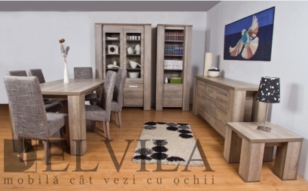Mobila sufragerie OLIMP - Ansamblu sufragerie compus din: Vitrina 2 usi sticla, L121,5xA49xH192,5 cm. Etajera 1 usa si 3 polite, L76,6xA49xH192,5 cm. Bufet 2 usi si 3 sertare, L200,8xA49xH85 cm. Masa fixa, L160xA90xH76 cm. Masuta de cafea, L110xA55xH45 cm. Masuta patrata, L55xA55xH45. 6 scaune Venus, L48xA40xH100 cm, lemn masiv de stejar, tapitat cu stofa. Pret: 5.536 lei.