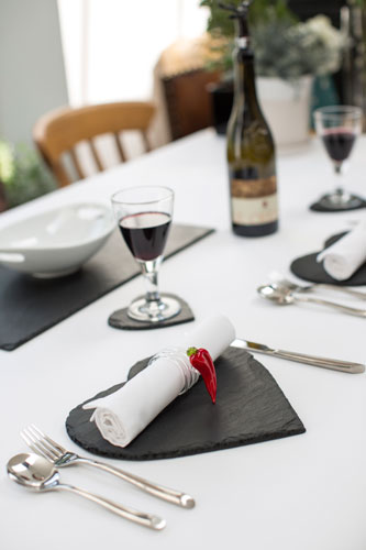 Daca esti adepta simplitatii sau a stilului minimalist, atunci iti recomandam sa optezi pentru combinatia alb-negru. Alege o fata de masa alba, simpla si servetele din material textil in aceeasi nota. Contrasteaza totul cu suporturi pentru farfurii, negre, din ardezie, care vor conferi un aspect elegant si impunator, in acelasi timp. Pentru a respecta tematica, iti recomandam sa lasi masa cat mai simpla si aerisita, apeland doar la strictul necesar.