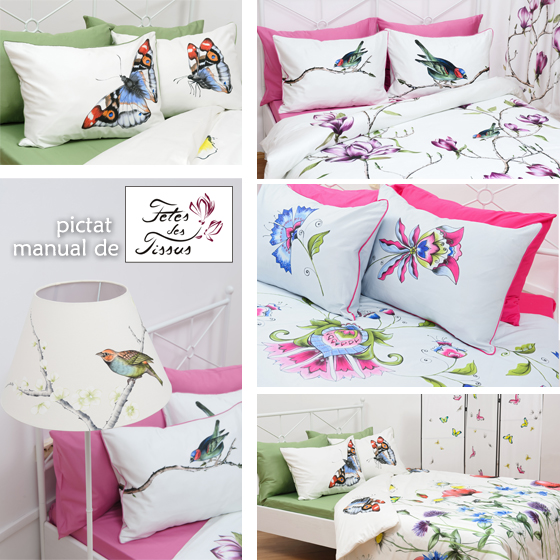 Modele unice de perdele, draperii sau cuverturi, croite cu atentie si pictate cu iscusinta de artistii Fetes de Tissus sunt realizate la comanda, in functie de cerintele clientului. Modelul poate fi transpus de catre artistii Fetes des Tissus prin pictura manuala pe diverse materiale (in, bumbac, matase, organza, satin).