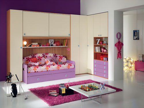 Mobilier pentru camera de copii, cu canapea extensibila si spatiu de depozitare, numeroase dulapuri, din MDF lucios, pret la cerere.