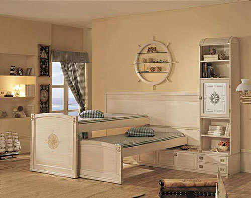 Compozitie dormitor copii, formata din paturi suprapuse, rafturi, spatii de depozitare, pret la cerere.