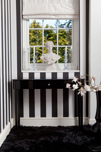 Peretii negri confera monumentalitate spatiilor, indiferent de natura lor. In locuinta, cea mai indicata metoda de a finisa peretii in aceasta non-culoare este prin intermediul tapetului. In cazul in care ai ezitari in alegerea unuia complet negru, poti opta pentru unul alb-negru. Cel in dungi este cel mai des intalnit si se potriveste oricarui stil decorativ. Pentru a echilibra vizual, alege un mobilier alb, ce va contrasta peretii.