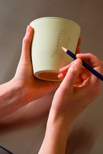 Desenati modelul dumneavoastra pe ghiveci folosind un creion. Incercati sa trasati liniile cat mai subtiri. Folositi o radiera pentru a sterge urmele nedorite.