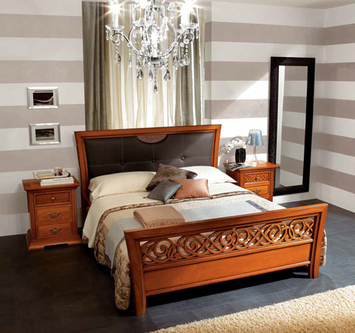 Decor Collection - Un dormitor din lemn masiv cu tablia patului tapisat cu piele si fronturi sculptate manual, un dormitor elegant pe stilul clasic. Finisaje: lemn frasin, cires, castan, nuc in diferite culori lacuite lucios.