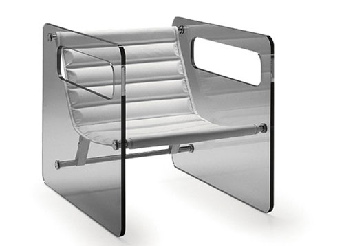Scaun Naked, brate din sticla si sezut din piele, disponibil si in varianta pe negru. Pret la cerere.