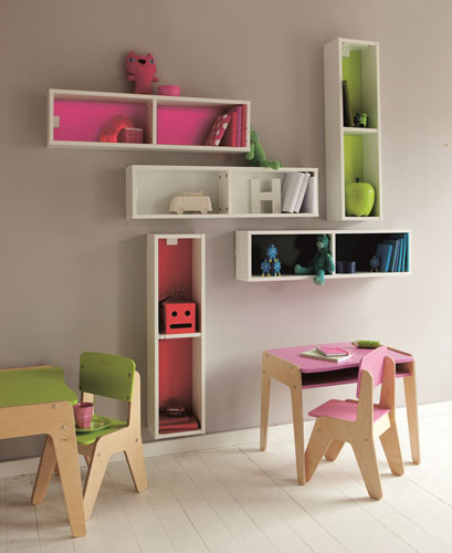 Depozitarea constituie o problema in orice locuinta, indiferent de functiunea incaperii la care ne referim. In camera unui adolescent, in care amplasarea cartilor constituie o problema, politele si etajerele nu trebuie sa lipseasca. Realizeaza diferite compozitii asimetrice, care sa anime spatiul si alege niste piese colorate, precum cele din imagine, piese ce pot fi folosite cu succes si in camera celor mici, pentru depozitarea jucariilor.