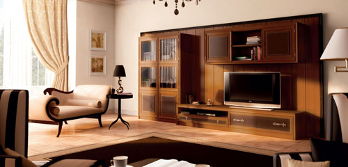 Glamour 7 - Un mobilier de living calsic ce imbina perfect lemnul masiv si fronturile imbracate in piele. Dimensiuni: L433/375 x 40/62 x H 208/192 cm. Pret la cerere.
