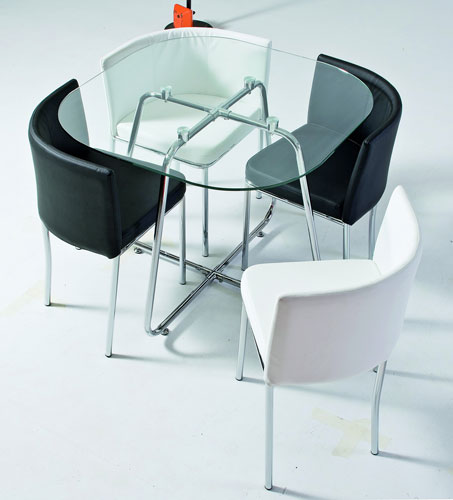 Set dining cu masa cu blatul din sticla si scaune albe si negre. Pret: 799 lei.