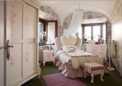 Dormitor Sogni e Amore, format din pat pentru o persoana, dulap haine si comoda, din lemn natural, pictat manual. Pret la cerere.