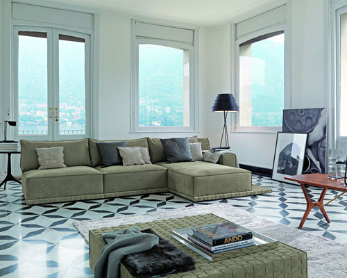 Coco - Compozitie modulara Coco, realizata pe cadru din lemn, cu tapiserie din piele naturala, disponibila in mai multe variante de finisaj. 350 x 113/192 x 82 cm. Pret la cerere.