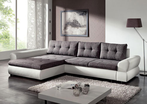 Coltar gama Alabama - Corp piele ecologica alba. Sezut si perne din stofa antracit. Spate material baza. Picioare plastic negru. Dimensiuni: cca. L 333. H 86. A 201 cm. Suprafata extensibila cca. 131 x 270 cm. Include lada de pozitare si functie pat. Pret: 3.690 lei.