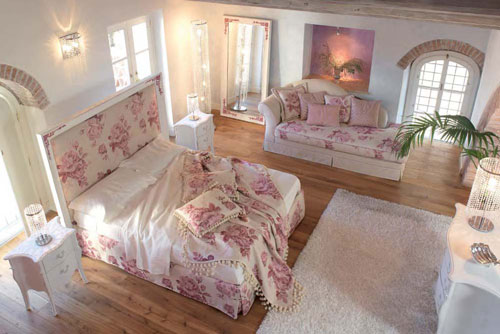 Pat dublu si sofa tapisate cu material textil, Colectia Countrychic. Pret la cerere.