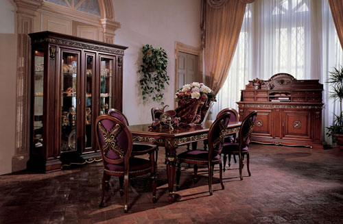 Mobilier pentru dining, colectia San Marco, format din scaune si masa extensibila, scaunele au tapiseria din material textil, pret la cerere.