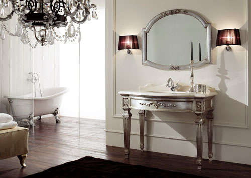 Domiziano - Un mobilier rafinat, care imprima masivitate, la care finisajele sunt realizate intr-o paleta cromatica ce mizeaza pe argintiu antichizat, completat de albul utilizat pentru obiectele sanitare. Cada cu picioare si chiuveta cu forme rotunjite intregesc tabloul elegant si luxuriant al stilului clasic. Mobilier si oglinda din lemn, cu detalii sculptate manual, finisaj argintiu; top lavoar realizat din marmura roz, 3 cm. grosime; cada alba, cu finisaje cromate. Dimenisiuni: Mobila lavoar: 106x60x93 cm. Oglinda: 94x92 cm. Pret la cerere.