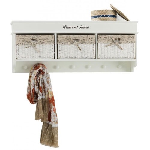 Cuier - MDF lacuit alb. 3 cosuri. 7 agatatori. L 100. H 40. A 20 cm. Dimensiuni cos: L 29. H 18,5. A 16,5 cm. Pret: 299 lei.