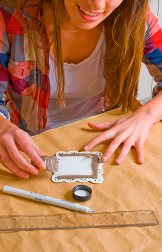 Desenati o margine a felicitarii folosind creionul de reliefare si cateva flori mici in fiecare colt, prin folosirea sabloanelor Dremel. Acoperiti cu pudra de reliefare liniile trasate. Scuturati excesul de pudra.