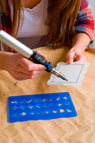 Folosind Dremel Versatip cu varful de aer fierbinte, reliefati cu grija pudra prin tinerea varfului la cativa centimetri fata de felicitare.