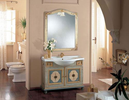 Procida - un mobilier pentru baie in stil clasic, caracterizat de un fin echilibru intre arta, forma si culoare. Mobilierul si rama de oglinda sunt realizate din lemn, cudetalii pictate manual, finisaj auriu; lavoar ceramic. Dimensiuni: Mobila lavoar: 105 x 50 x 82 cm. Oglinda: 90 x 110 cm. Pret la cerere.