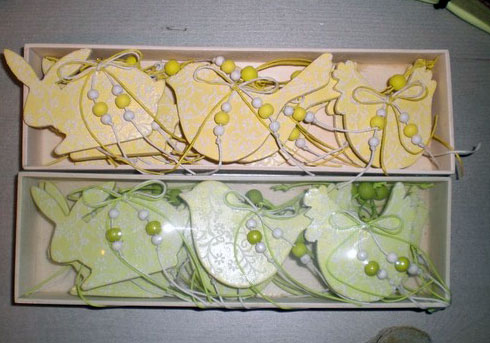 Set ornamente agatat, set 9. Cutie lemn 24x7x2 cm. Cu model flori, perle si banda de agatat. Verde pastel / galben pastel. Pret: 39,99 lei.