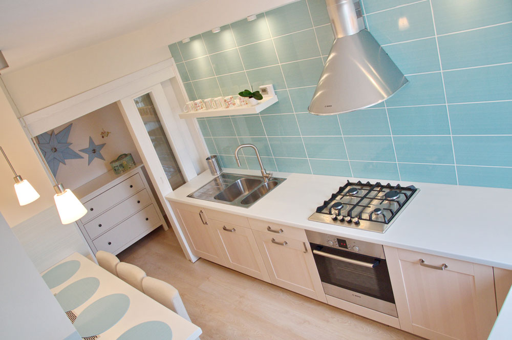 Bucataria este una vesela si luminoasa, iar detaliile au fost cele pe care designerul a pus accent. Apartamentul dispunea de o camara, care a fost integrata in bucatarie, in locul sau aflandu-se, in prezent, frigiderul si centrala termica, mascata de un dulap.