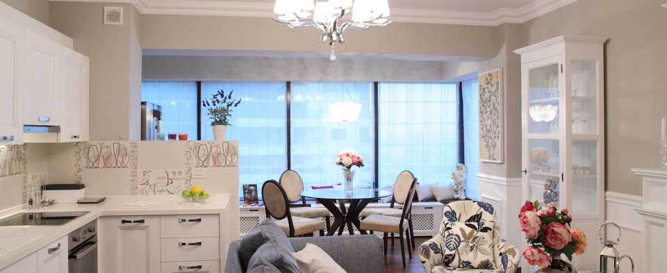 In ceea ce priveste paleta cromatica, cuvantul in jurul carora designerii au conceput proiectul este "delicatete". Astfel, tonurile pale de bleu au fost alaturate celor de crem si alb. Intrucat apartamentul este unul cu doua camere, s-a optat pentru un open space, in care au fost integrate bucataria, livingul, zona de dining si cea de birou, cea de-a doua camera servind ca dormitor.