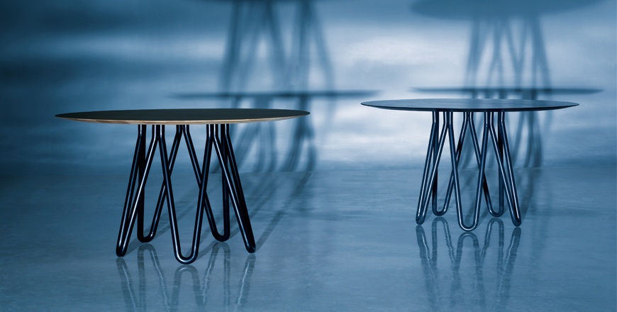 Masa Meduse, cu structura realizata din metal vopsit si top din lemn de frasin (finisaj natur sau negru) sau sticla. Dimensiuni: Ø 130 cm; H 73 cm. Pret: de la 919 euro + TVA
