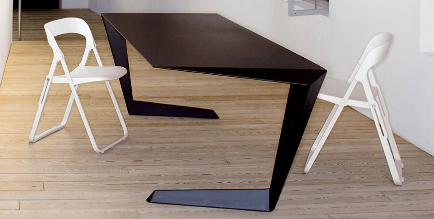Casamania - masa pentru dining, cu un design modern, inspirat din tematica aeronautica si militara. Realizata din aluminiu. Design Norayr Khachatryan. Disponibila in mai multe variante de culori: alb, negru, rosu. Pret la cerere.