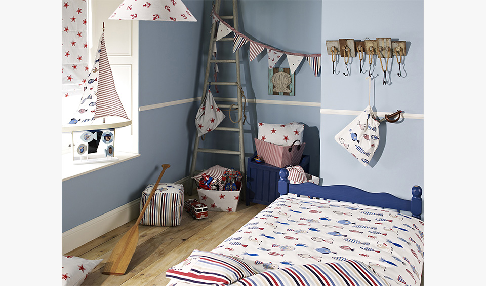 Material pentru tapiserie si draperie din colectia Be Happy, cu imprimeu cu tematica pescareasca, ce ofera posibilitatea unui decor original pentru camera copiilor. Pret la cerere