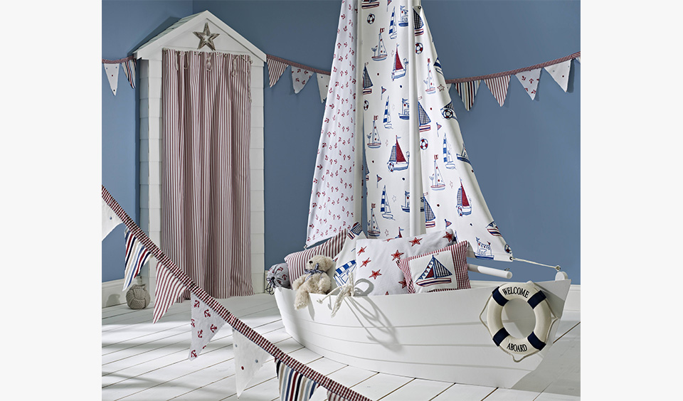 Material pentru tapiserie si draperie din colectia Be Happy, cu imprimeu cu tematica marina, ideala pentru decorarea camerelor pentru baieti. Pret la cerere