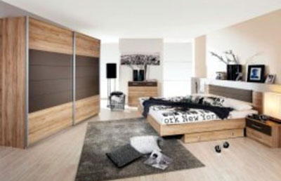 Barcelona - Corp si front stejar Sanremo. Decor lava gri. Dulap 2 usi, L 226. H 210. A 62 cm. Pat cu suprafata dormit 180x200 cm. 2 Noptiere cu 2 sertare. Pret: 2.299 lei.