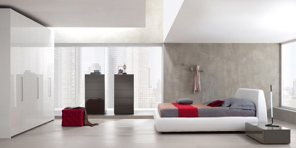 Mobilier pentru dormitor Exential Notte, finisaj lacuit lucios, in combinatie cromatica de alb si gri. Compozitia contine: