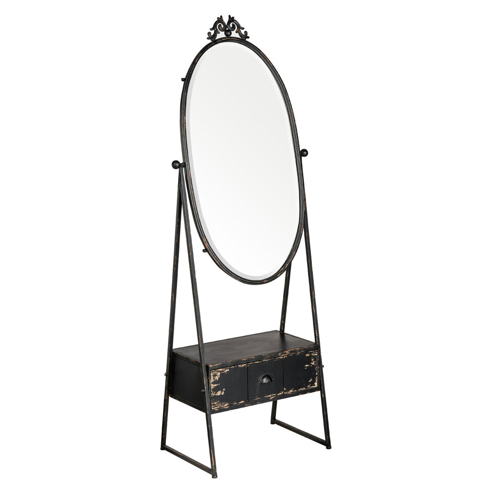 Oglinda de podea din colectia New York, cu spatiu de depozitare cu sertar. Structura si rama din fier forjat. Finisaj negru antichizat. Dimensiuni: 65 x 42 x 178 cm. Pret: 405 euro + TVA