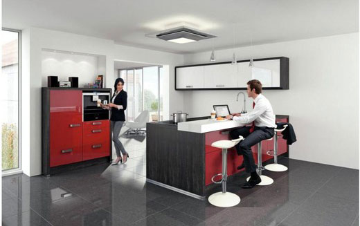 Bucatarie Nova Brillant - Primul aspect important la aceasta bucatarie este accesul foarte usor la toate spatiile de depozitare. Configuratia superioara asigura o mai buna comunicare a spatiului de lucru. Specificul acestei bucatarii il reprezinta vopseaua rosie, glossy, Monza, precum si blaturile de 50 mm. Designul SOFTline, cat si elementele care alcatuiesc acest design,corpuri atat joase cat si inalte, panouri moderne, dau bucatariei un aspect estetic soft.