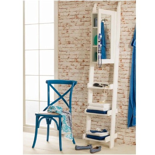 Raft din pin lacuit alb, cu 3 polite si o usa de depozitare, cu oglinda. Dimensiuni: L 46. H 200. A 35 cm. Pret: 599 lei.