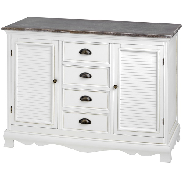 Dulap din colectia Louisiana, cu 4 sertare si 2 usi, realizat din lemn. Finisaj alb antichizat. Top din lemn, finisaj natur. Dimensiuni: 110 x 40 x 80 cm. Pret: 475 euro + TVA