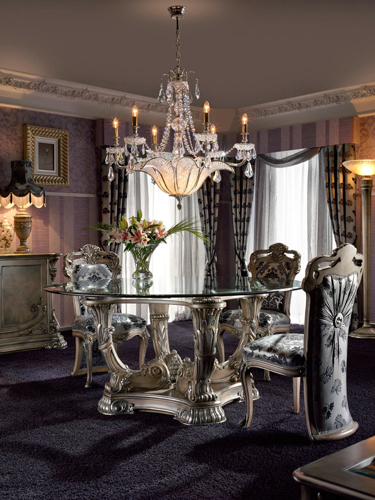 Masa de dining Perla cu scaune din lemn sculptat manual, decorate cu foita de aur si tapiserie din materiale de lux, pret la cerere.