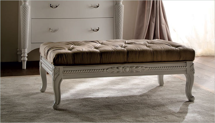 Pouf Artu - cu un design rafinat, acest pouf elegant ofera o nota de distinctie dormitorului Dvs. Structura si picioare realizate din lemn masiv, sculptate; finisaj alb anticizat. Tapiserie din material textil. Dimensiuni: 112 x 67 x 40 cm. Pret la cerere.