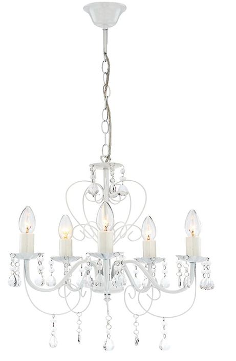 Lustra Pinja - 5xE14 40W 230V. Diametru: 44cm. H 150cm. Material: Metal alb. Cristale acril transparente. Pret: 269 lei.