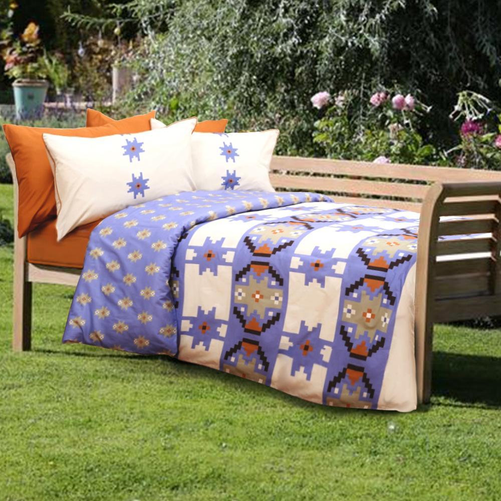 Tip tesatura: percale. Densitate: 130 gr/mp. Culoare: crem/portocaliu/albastru. Intretinere: spalare la masina automata - maxim 40 grade C. Pret: 402 lei.