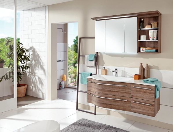 Set baie Leonardo - Front sticla albastra. Corp alb lucios. Compus din: masca lavoar, lavoar marmura minerala, oglinda simpla cu iluminat led. Inchidere silentioasa. L 60 cm