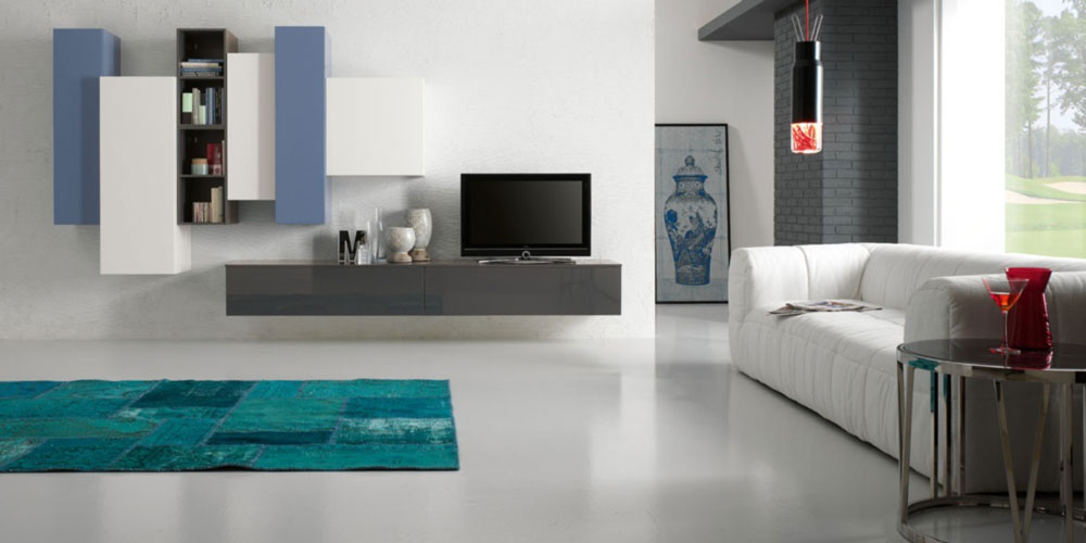 Mobilierul este realizat din MDF, finisaj lacuit lucios, disponibil in mai multe variante cromatice. Dimensiuni compozitie: 345 x 54 x 195 cm. Pret compozitie: 2.627 euro + TVA