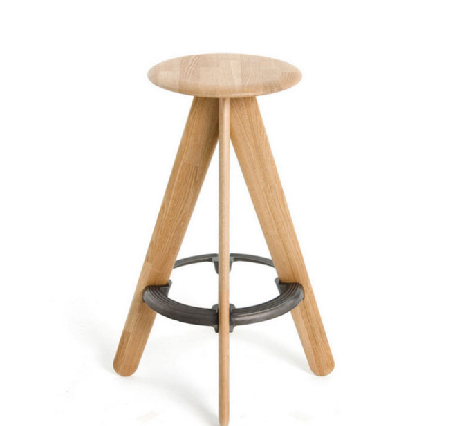 Slab stool - Tom Dixon. Slab stool este un scaun de bar creat de Tom Dixon si lucrat din lemn masiv de stejar. Pentru o stabilitate desavarsita, designerul a incorporat un inel din fonta ce traverseaza circular cele patru picioare de lemn. Suprafata este bine slefuita astfel incat fibra lemnoasa este foarte vizibila. Pret: 1.699 lei.
