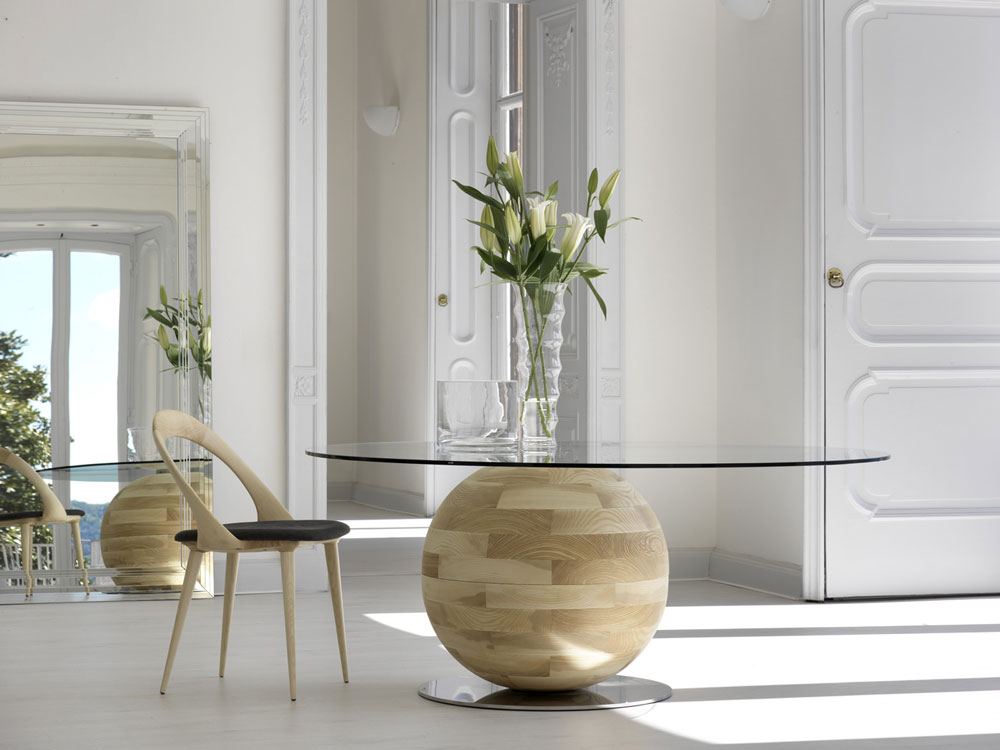 Gheo - Masa pentru dining Gheo. Picior realizat din lemn masiv de nuc sau frasin, fixat pe o baza metalica. Top din sticla securizata - 12 mm grosime. Dimensiuni: diam. 170 cm. H. 73cm. Pret la cerere