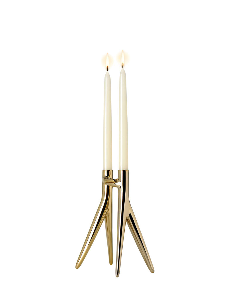 Suporti lumari KARTELL - Abbracciaio. design Philippe Starck si Ambroise Maggiar 2012. Kartell propune ca si suport de lumanari, un sfesnic compus din doua structuri din aluminiu, care puse una in fata celeilalte transforma produsul intr-o imbratisare. Elegante si poetice, suporturile Abbracciaio sunt realizate in culori diverse, fie cu efecte metalice, sau in alb sau negru. Pret: 707 lei.