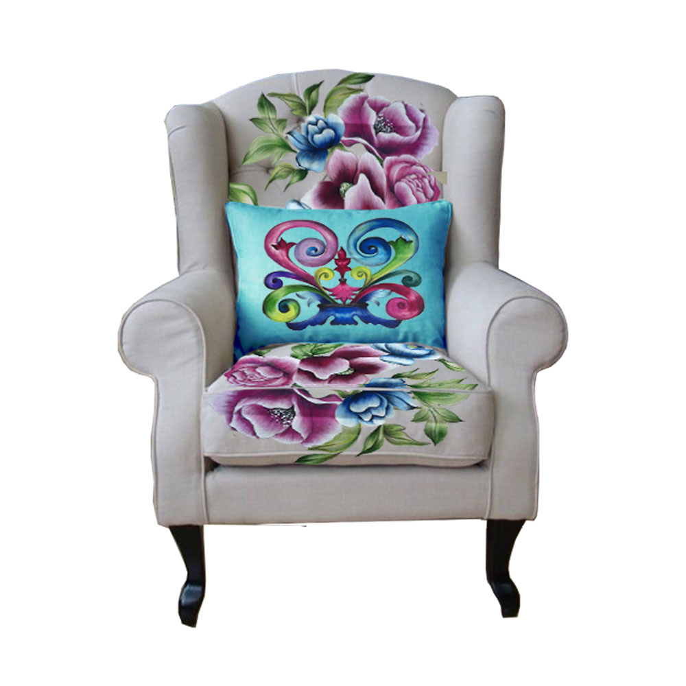 Fotoliu cu tapiterie pictata by Fetes des Tissus - Antwerpen v2, pictura manuala. Fotoliu clasic realizat cu insertii de tesatura pictata manual. Pictura este inspirata din motivele ce se regasesc in portul popular, iar pernuta este inspirata din motivele vegetale care se regasesc in arhitectura brancoveneasca. Pret la cerere.